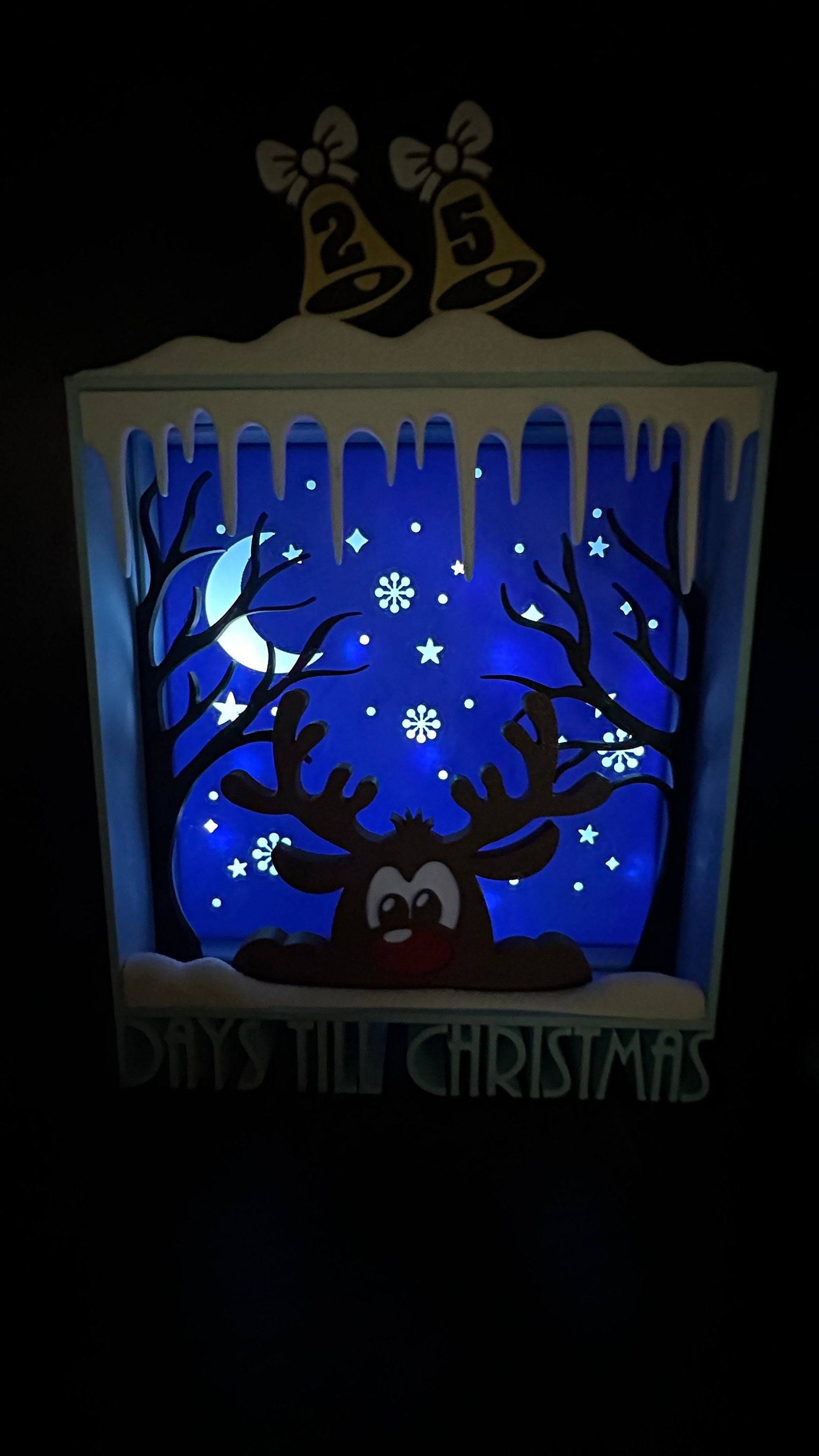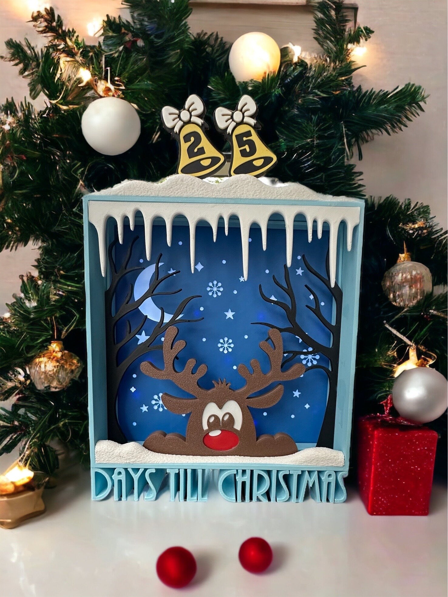 Add some excitement to your Christmas countdown with this Reindeer advent calendar. The Christmas decor is beautifully illuminated with white lights, making it a delightful spectacle to behold even at night.